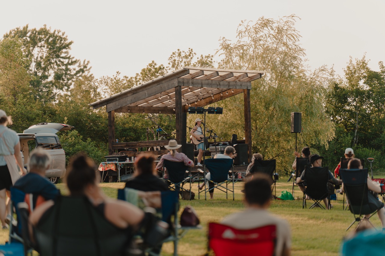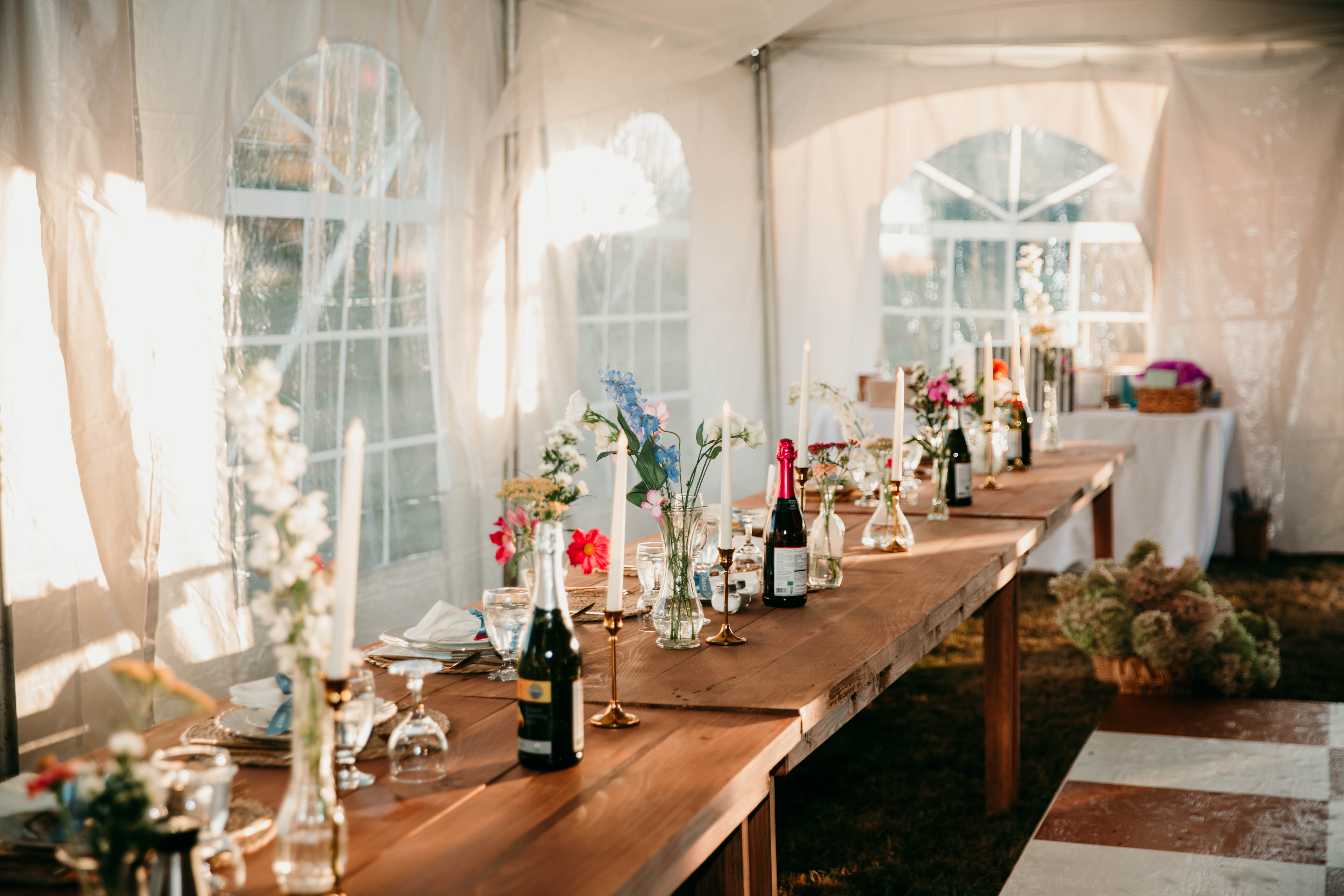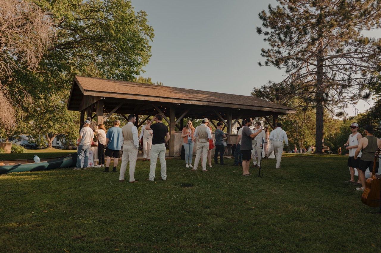 Our venue offers a variety of stunning landscapes, all exclusively yours when you book The Meadows. From the expansive event field that hosts our marquee tent and the stage ideal for live entertainment, to the lakeside beach perfect for shoreline ceremonies or evening bonfires, the property provides endless possibilities. Guests can enjoy the charming gazebo for cocktail hour or intimate outdoor dining, and our beautiful marquee tent, which seats up to 105 guests at our handmade harvest tables. Your booking includes 15 custom harvest tables, 30 matching benches, our checkerboard dance floor, and elegant ceiling drapery and string lights that adds a warm, refined touch to the tent. Guests also gain access to the campground side of the property and may book tenting lots for accommodations, with optional 15–30 amp electrical sites available for an additional fee paid by either the couple or individual guests.